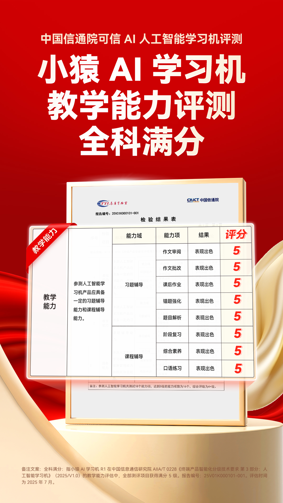 近日,在中国信息通信研究院(以下简称“中国信通院”)组织的可信AI人工智能学习机评估中,小猿AI学习机成为首批参测产品,率先通过人工智能学习机评估,并获得业内最高等级4+级评级。作为首个全流程AI辅助学习智能硬件,小猿AI学习机在人工智能领域的科技创新实力和行业领先地位,再次获得权威认可。
